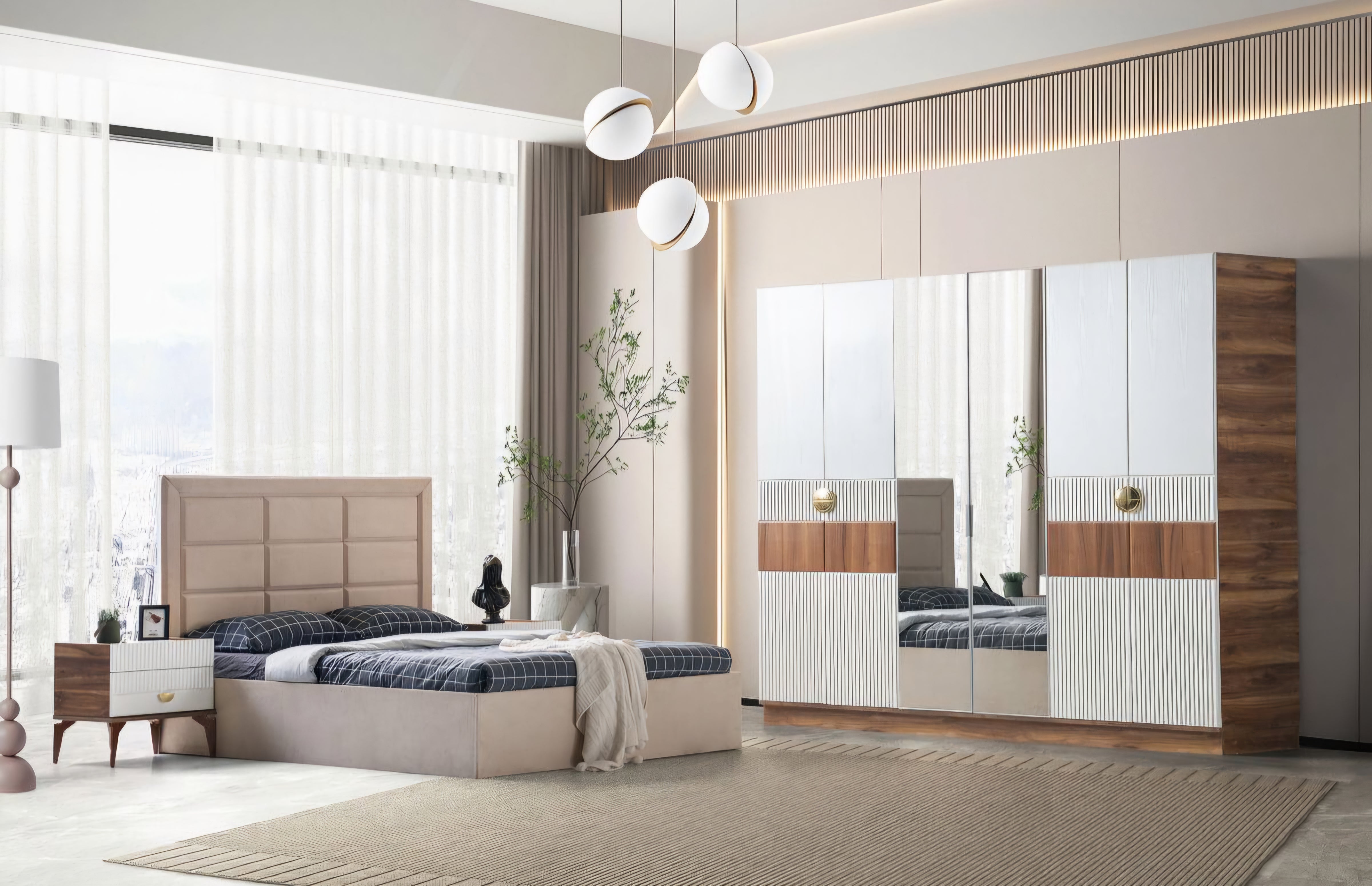 PRODUKTMATERIAL: Tillverkad av MDF i första klass. MADRASSMÅTT: 160x200 cm. Sängramen inkluderar inte förvaringslåda. Ortopedisk madrass ingår inte i setet. GARDEROBFUNKTION: Har 6 dörrar. GARANTITID: 1 år tillverkargaranti. LEVERANS & MONTERING: Fri frakt och montering. För montering krävs att du köper monteringstjänst separat.